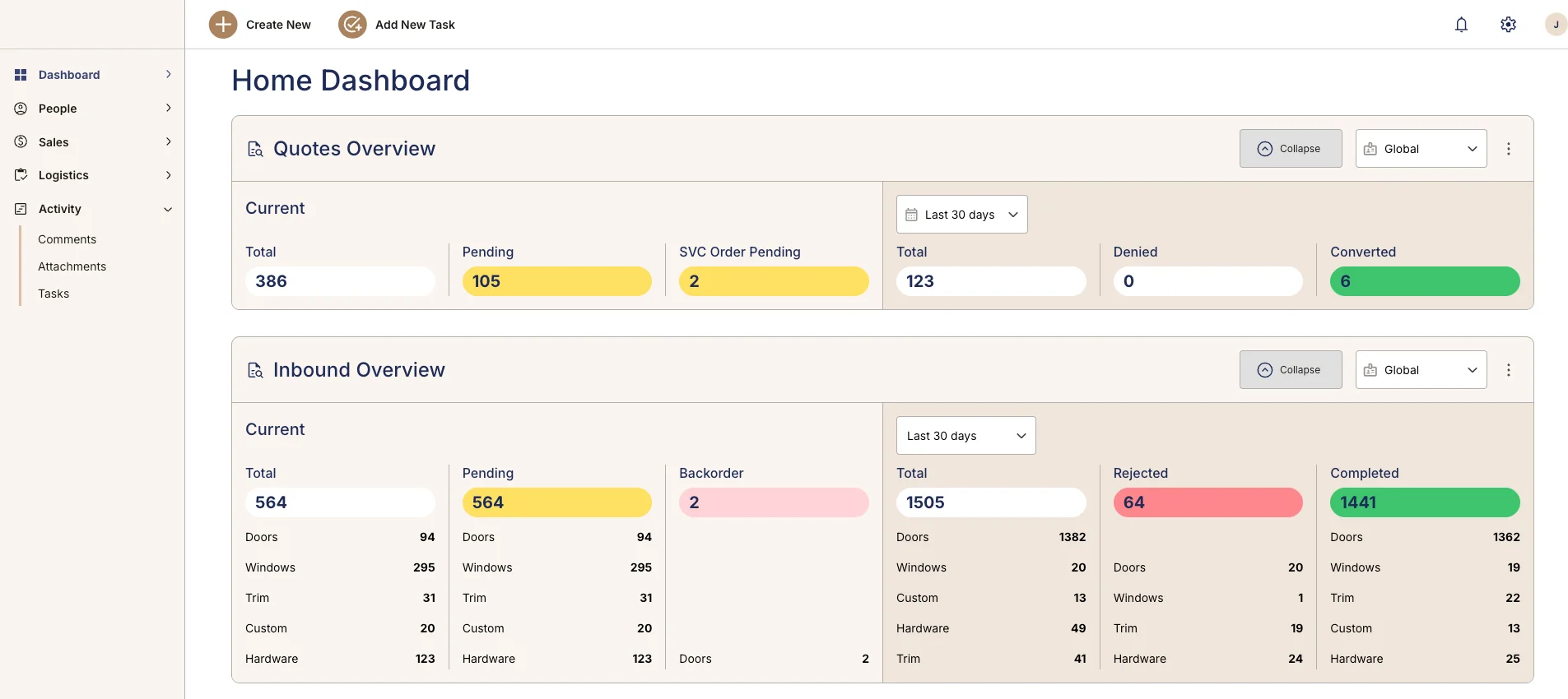 This isn't manufacturing ERP with a lumber skin, and it isn't a lightweight order tracker with a modern coat of paint. OmniView is a full ERP - quoting, CRM, orders, purchasing, inventory, production, logistics, project management, returns - built from the ground up for dealers and distributors who deal in custom orders, variable pricing, shifting timelines, and a hundred exceptions before lunch. Every workflow, every field, every default reflects how your business actually runs.